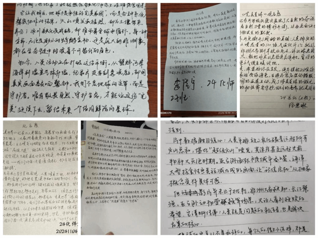 活动伊始,主持人讲解了本次活动的宗旨与意义,倡导爱护环境从点滴做起,从小事做起,要努力奋斗共同建设美丽校园。随后,环境保护纪录片《完美星球》正式开始播放。参与活动的同学们迅速将注意力高度集中于屏幕之上,全神贯注地观看影片,所有人都沉浸在影片所营造的严肃氛围之中。活动渐近尾声,同学们纷纷拿起笔,将观影时心中翻涌的万千思绪化作文字,在纸张上倾吐着对《完美星球》的独特感悟,现场气氛肃穆凝重,同学们纷纷表示要加入保护环境、保护生物多样性的队列中。