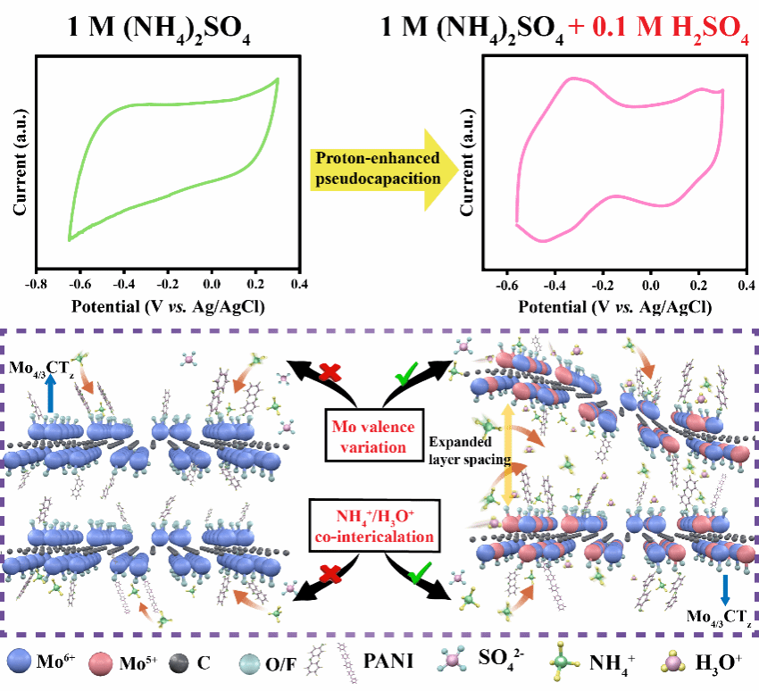 图1. 质子对复合材料赝电容的影响和NH4+/H3O+共储存机理