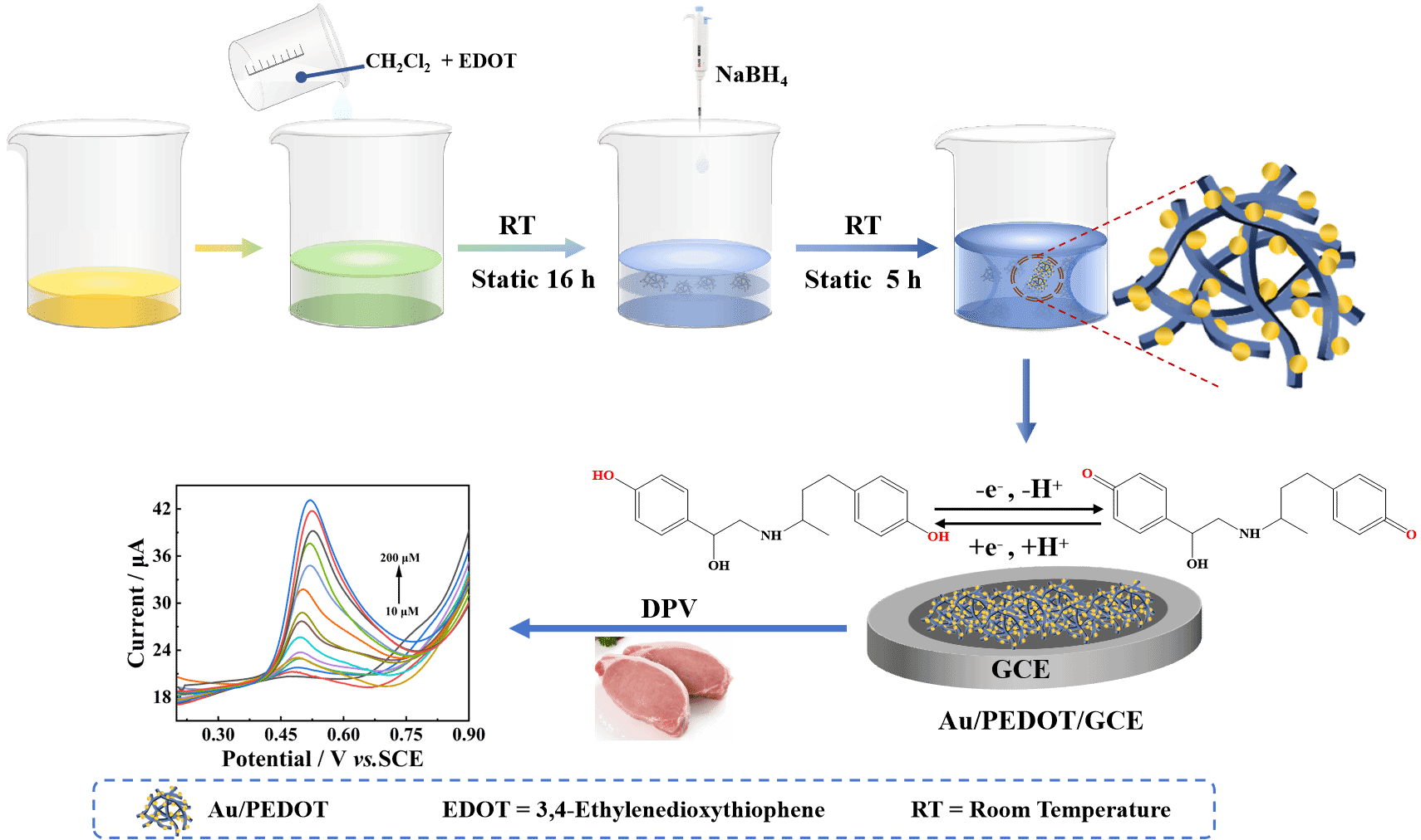 图1 Au/PEDOT纳米线传感平台的构建及对猪肉中莱克多巴胺高效检测示意图。