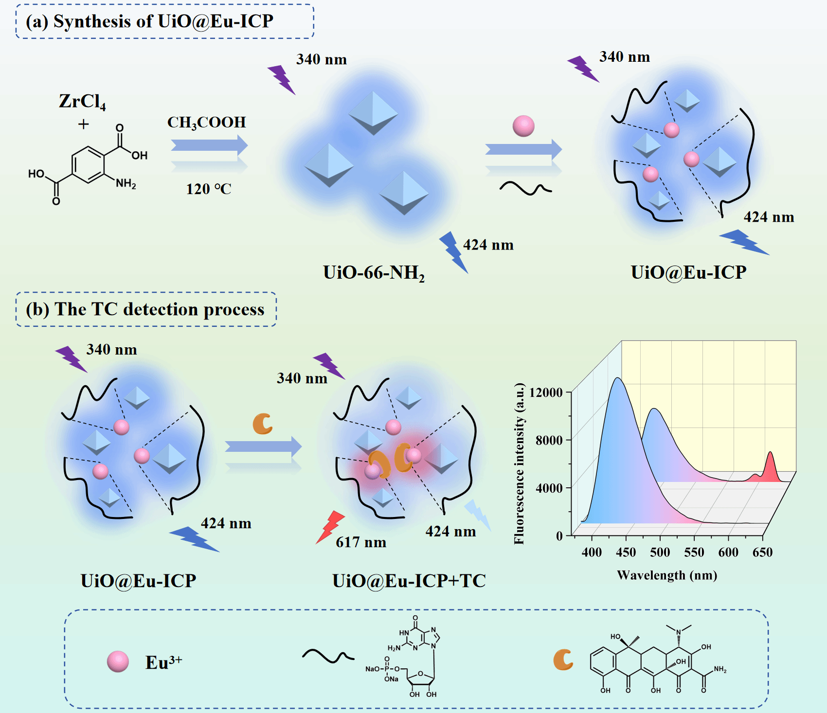 图一 (a) UiO@Eu-ICP的合成流程;(b) UiO@Eu-ICP的TC检测过程