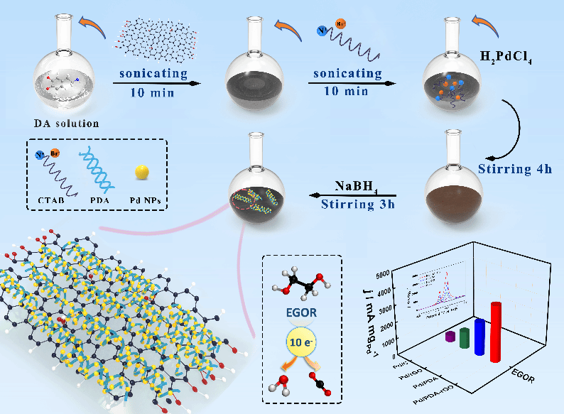 图1Pd/PDA-rGO复合催化剂的原位制备流程、微观结构、乙二醇电催化氧化反应(EGOR)过程及相关催化性能对比。