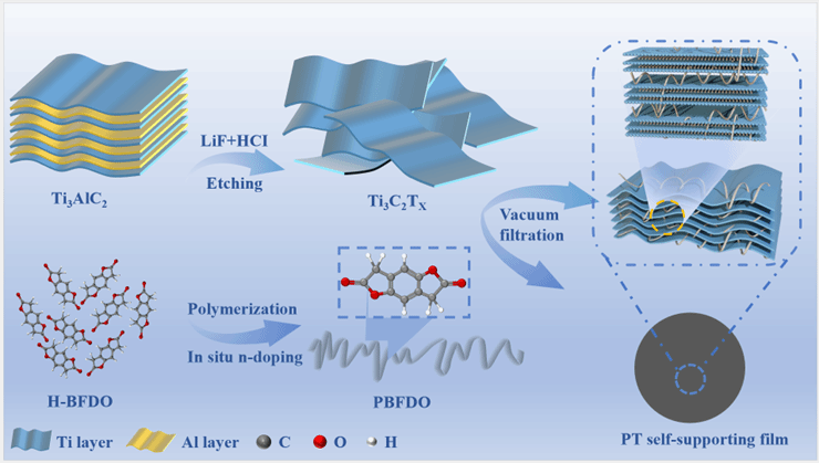 近日,江西科技师范大学化学学部刘佩佩教授课题组在《Journal of Energy Storage》上发表了题为“Ultralong cycle stability poly(benzodifurandione)/Ti3C2Tx films as novel self-supporting electrodes for supercapacitors”的研究成果。