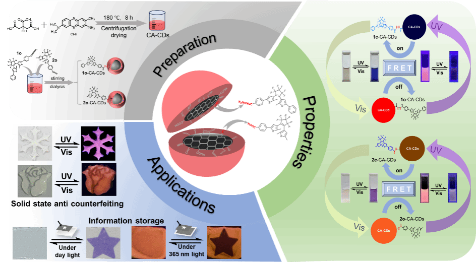 碳点(CDs)因其卓越的光稳定性与可调节的荧光发射特性而备受关注。然而,传统合成方法制备的碳点主要发射蓝光或绿光,且其发射强度难以调控,这极大制约了该类材料的应用拓展。本研究中,我们通过红色荧光碳点与两种二芳基乙烯分子构建了双荧光开关体系。该体系在紫外/可见光照射下可实现荧光强度的可逆调控,其调控效率分别高达94%与80%。两种荧光开关的抗疲劳性能(耐循环切换次数)分别达到20次和12次。此外,该双开关体系成功应用于防伪及光存储领域。本研究为荧光开关的构建提供了新范式,并显著拓宽了其应用场景。