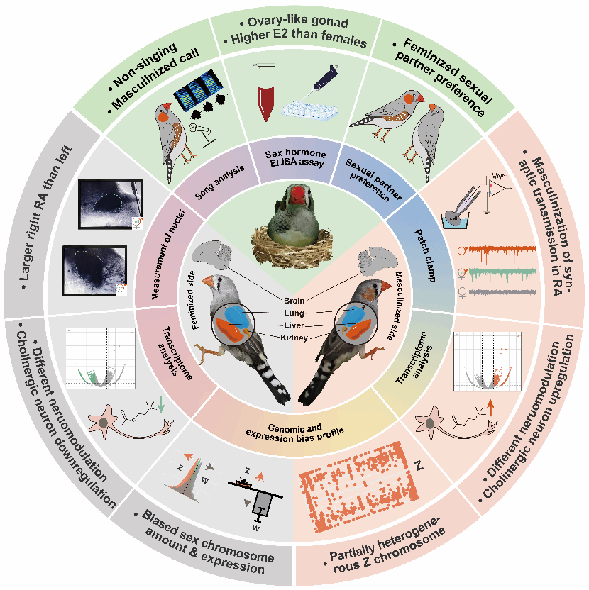 研究团队偶然获得一例成年雌雄嵌体斑胸草雀,其右侧具雄性羽毛特征,左侧为雌性羽毛,但体内仅有一个卵巢样性腺。尽管该个体不发出典型的雄性鸣唱,但其叫声的频率调制与基频表现出部分雄性化特征。性伴侣偏好测试表明,其行为模式更接近雌性,偏好选择雄性伴侣。研究发现该个体血浆雌二醇水平显著高于同龄雌性,这可能与其较大的卵巢样性腺有关。进一步对大脑鸣唱运动核团RA的研究显示,右侧(雄性化侧)RA核团大小显著大于左侧(雌性化侧)。全细胞膜片钳记录表明,右侧RA投射神经元的微小兴奋性突触后电流频率与振幅均接近正常雄性水平,显著高于雌性,提示其兴奋性突触传递呈现雄性化。
