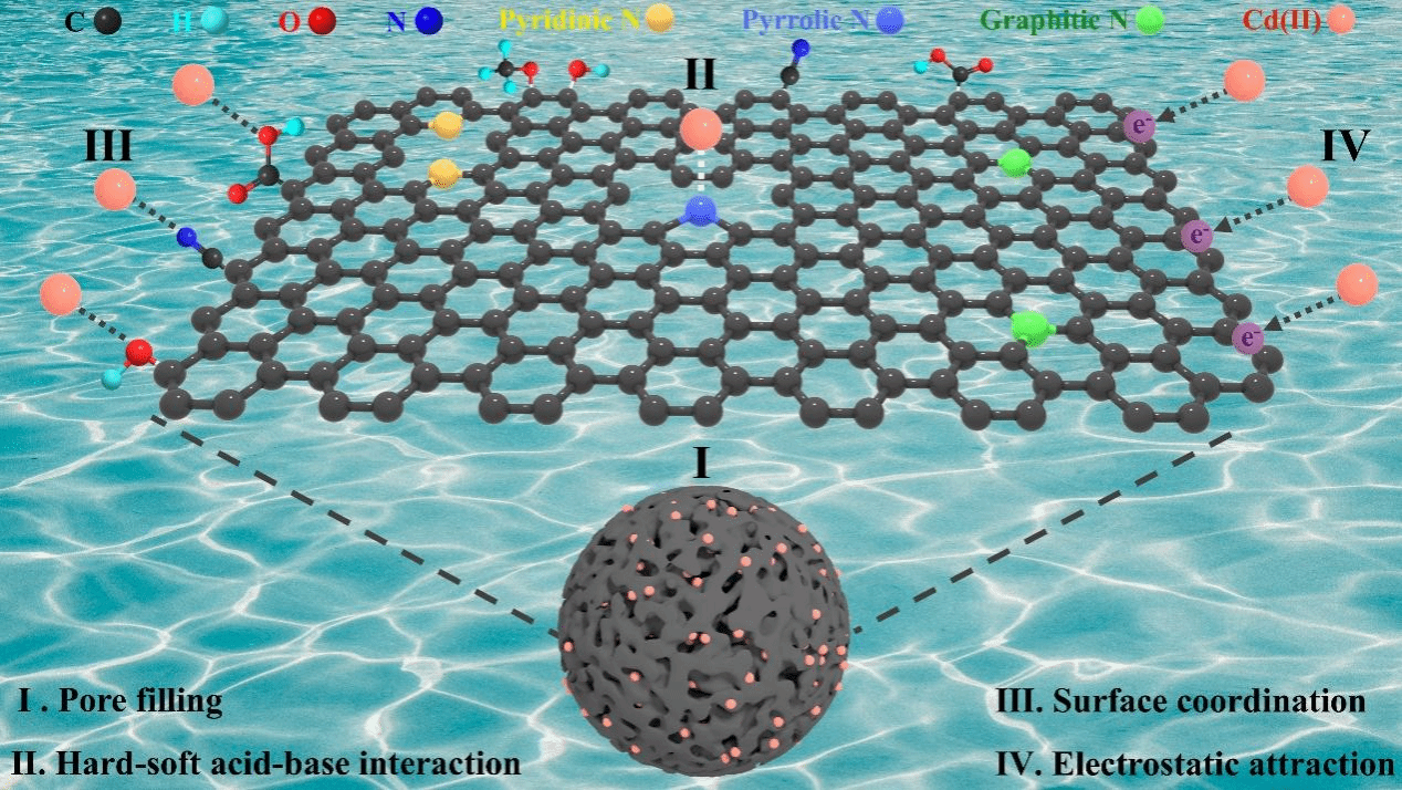 镉是一种危害显著的重金属污染物,易通过工业排放进入水环境,对生态系统和人体健康构成持续威胁。本研究通过一锅法合成了以造纸废料碱木质素为碳源的新型氮掺杂分级多孔碳材料,用于高效去除水体中的镉。该材料在较宽pH范围内吸附性能稳定,抗共存离子及有机质干扰能力强,对镉的最大吸附容量高达519.8 mg·g-1。机理分析表明,其对镉的去除是表面配位、孔隙填充、静电吸引及硬软酸碱作用等多种机制协同的结果,实现了化学吸附与物理吸附的联合作用。该工作践行了“以废治废”的可持续理念,为镉污染治理提供了一种经济、高效且环境友好的新途径。