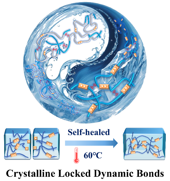 合成兼具优异机械性能与在温和条件下高效快速修复能力的聚合物仍面临重大挑战。本研究团队以冰的高硬度及水的快速修复特性为灵感,设计出一种基于晶区锁定动态键的聚氨酯材料,该材料在室温下具有优异机械性能,并能在温和温度下实现高效自修复。动态二硫键被锁定在结晶柔性链中,使聚合物在熔点以下保持刚性以确保高机械性能。当达到熔点时,柔性链与动态二硫键会释放,链扩散与动态键交换反应的协同效应实现了高效的自修复性能。制备的聚氨酯在室温下表现出9.37 MPa的拉伸强度和479%的断裂伸长率,60 ℃时自修复效率达92%。这种晶区锁定动态键为机械性能与自修复能力之间的灵活调控提供了可行解决方案。