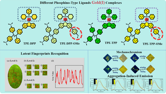 图1.新型含膦金(I)分子(TPE-DPP、TPE-TPP、TPE-DPP-OME和TPE-TPP-OME)的结构和AIE、力致荧光变色及其应用示意图