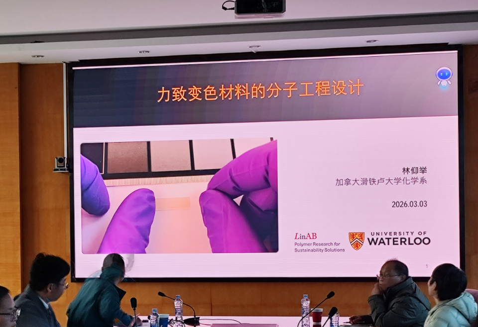 讲座中,林仰举教授以力致变色材料的分子工程设计为核心,系统阐述了高分子力化学领域的前沿研究逻辑。他首先聚焦力敏团的分子设计原理,深入解析了机械力诱导下分子结构转变的核心机制,清晰阐释了应力诱导分子反应的动力学过程与能量变化规律。随后,林仰举教授结合团队研究成果,详细介绍了力致变色材料在分子尺度的结构调控策略,并展现了该材料在智能传感、损伤监测等领域的广阔应用前景。
